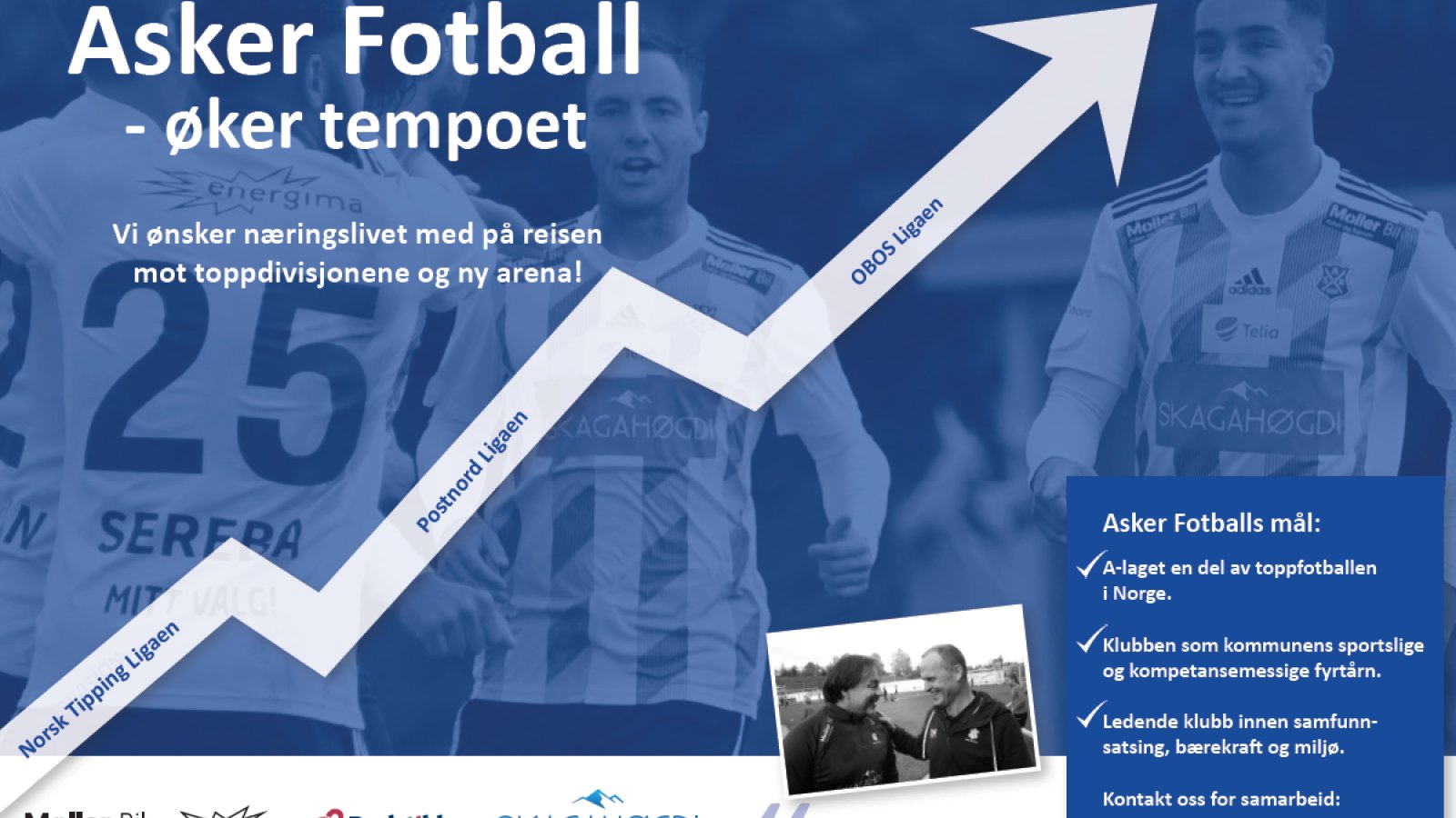 Asker Fotballs A-lag har hatt en svært god utvikling til tross for Covid-19. Vår målsetting er opprykk til OBOS ligaen i 2021/22. Vi har nå en stabil og samkjørt stall med spillere, et meget kompetent trenerapparat med Vegard Skogheim som hovedtrener og en svært dyktig daglig leder/sportslig leder i Rolf Magne Walstad.